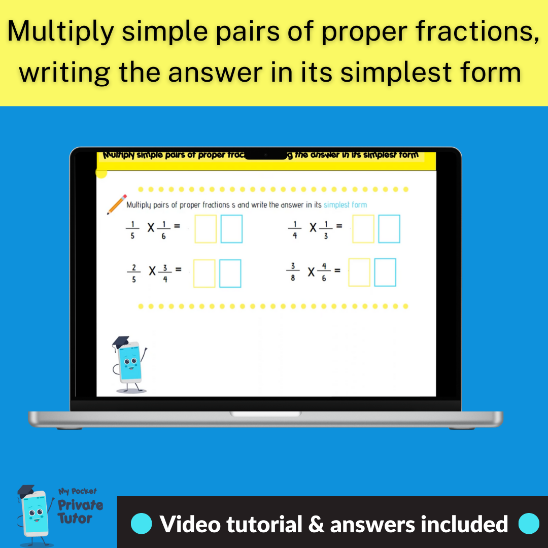 SATs style worksheet with answers included for the Year 6 National Curriculum objective: Multiply simple pairs of proper fractions writing the answer in its simplest form